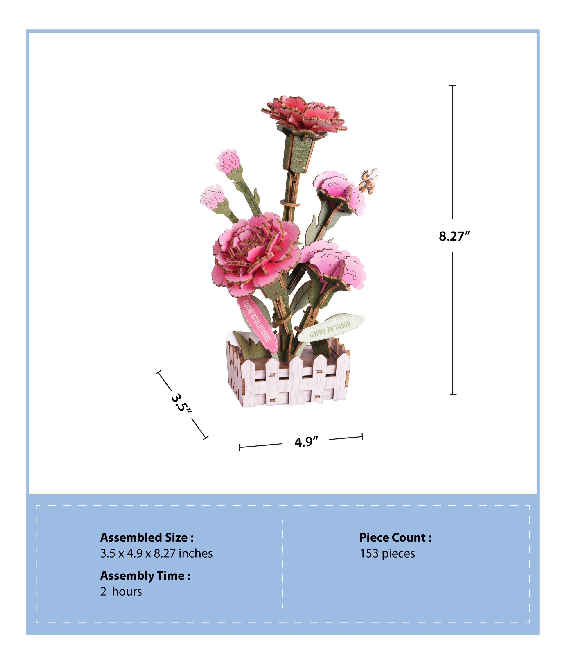 Create a beautiful carnation with this DIY miniature wooden puzzle. Designed to capture the carnation's signature ruffled petals and full, layered bloom, this set brings depth and charm to a small-scale floral display. Each precision-cut wooden piece fits together smoothly without glue or tools, making assembly relaxing and enjoyable.